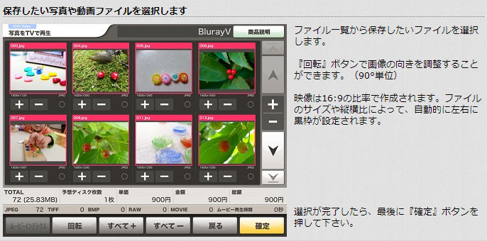 『写真や動画をTVで再生+保存』にはDVD版とBlu-ray版があります。 現在ご利用の再生機器に合わせてどちらかをお選び下さい。 他にも注文したい商品がある場合は、『オーダーリスト』か ら 『他のサイズもオーダーする』ボタンを押して、注文を続けて下さい。